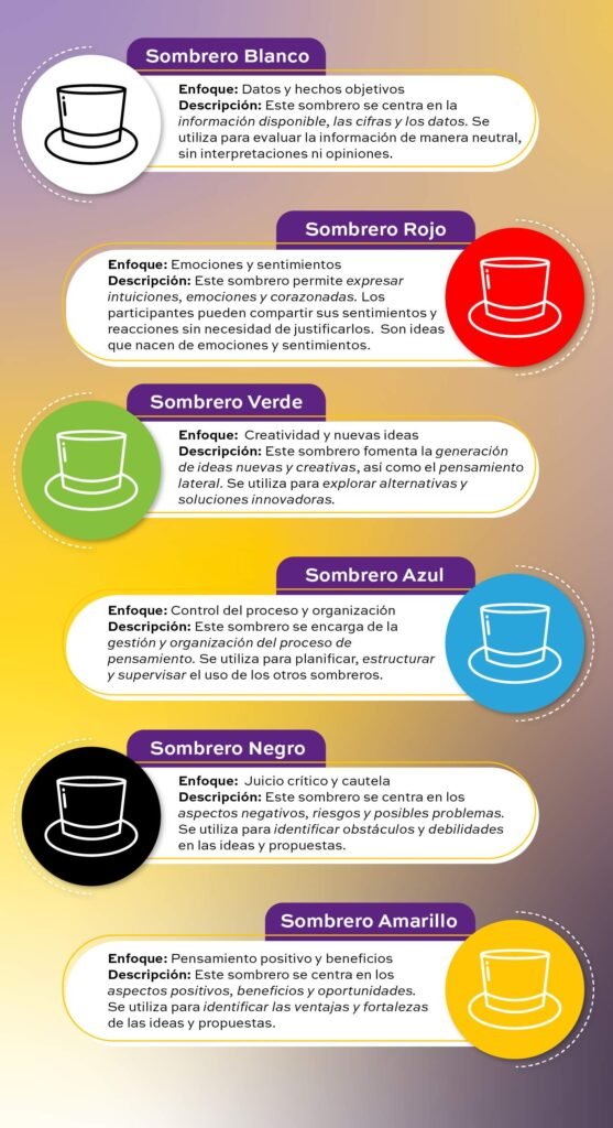 Al “ponerse” uno de estos sombreros, los participantes adoptan una perspectiva específica, lo que facilita la exploración de problemas y soluciones desde múltiples ángulos. A continuación, descubre cómo cada sombrero puede ayudarte a organizar tus ideas de manera más efectiva.